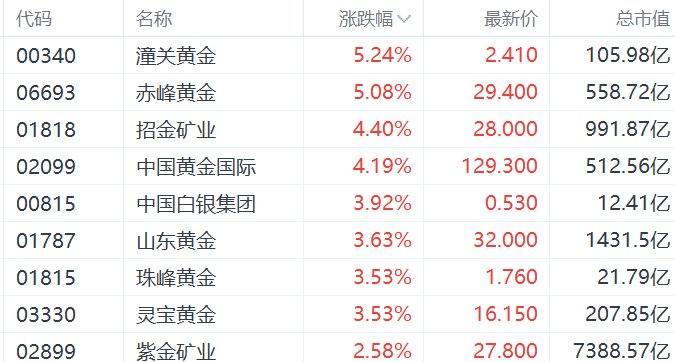 金价新高不断,港股黄金股集体高开。其中,潼关黄金、赤峰黄金涨超5%,招金矿业、中国黄金国际涨超4%,中国白银集团、山东黄金、珠峰黄金、灵宝黄金涨超3%,紫金矿业涨超2%。值得注意的是,招金矿业、中国黄金国际、山东黄金、灵宝黄金均再创历史新高。