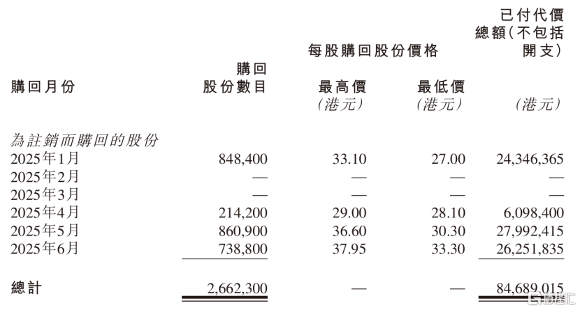 财报显示,公司拟派发中期股息每股0.35港元,合计拟中期分红7576.6万元,占中期净利润的50%,兑现此前“将每年净利润的30%-50%进行分红或回购”的承诺。同时,延续自2023年8月起的常态化回购策略,公司上半年累计斥资回购超8468万港元,并推进股份注销程序以提升股东权益回报率。
