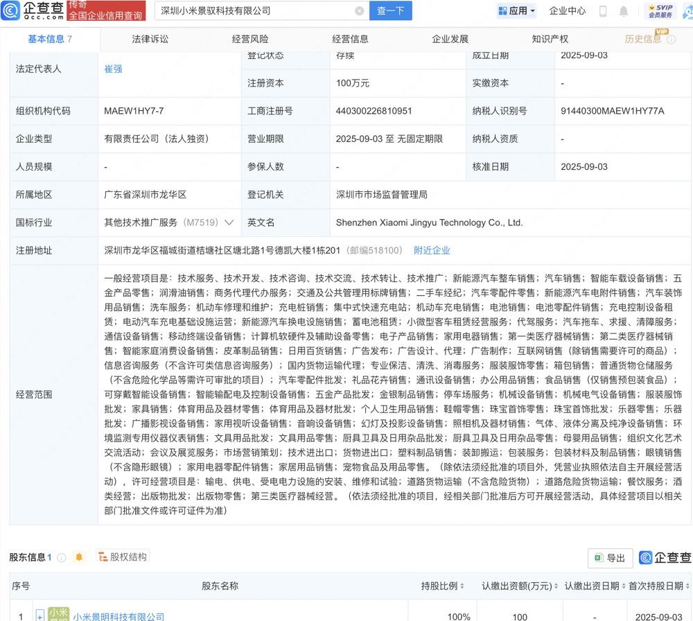 企查查APP显示,近日,深圳小米景驭科技有限公司成立,法定代表人为崔强,经营范围包括新能源汽车整车销售、智能车载设备销售、五金产品零售等。企查查股权穿透显示,该公司由小米景明科技有限公司全资持股。