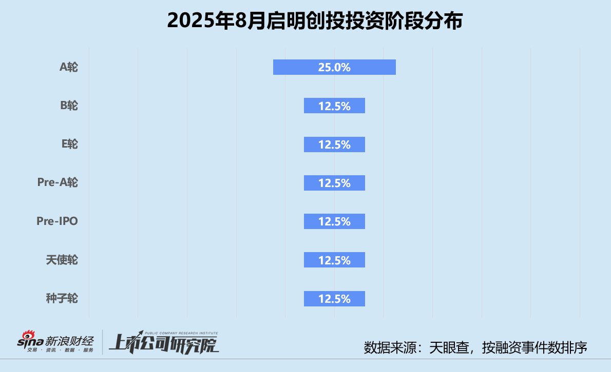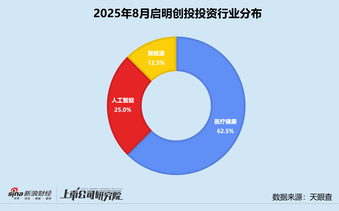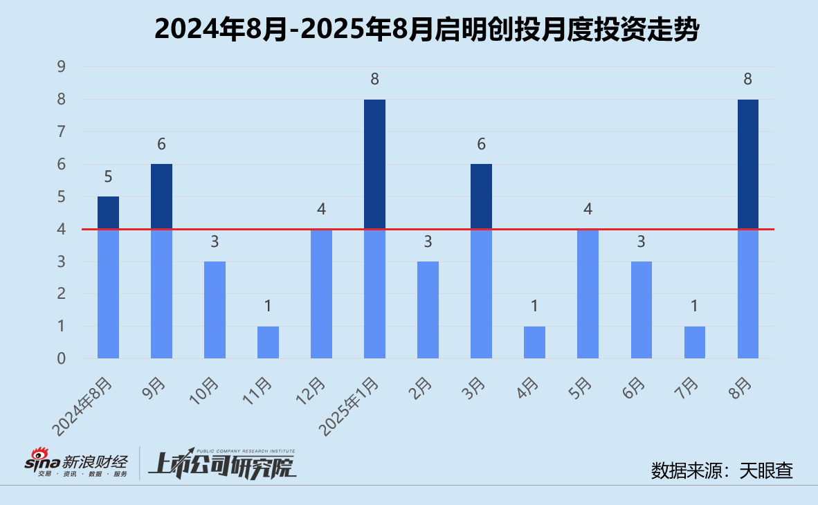 除了高调入主上市公司,统计区间内,启明创投公开披露的股权投资事件共8起,较2024年8月显著增长60.0%,与2025年7月相比翻了8倍。结合往期数据分析,启明创投的投资活跃度呈现“脉冲式”特征,2024年11月、2025年4月和7月探底,在市场环境阶段性趋冷的情况下,其调整投资节奏;2025年1月和8月冲高,投资事件数双双达到8起,或是为捕捉医疗健康、人工智能等赛道窗口期。