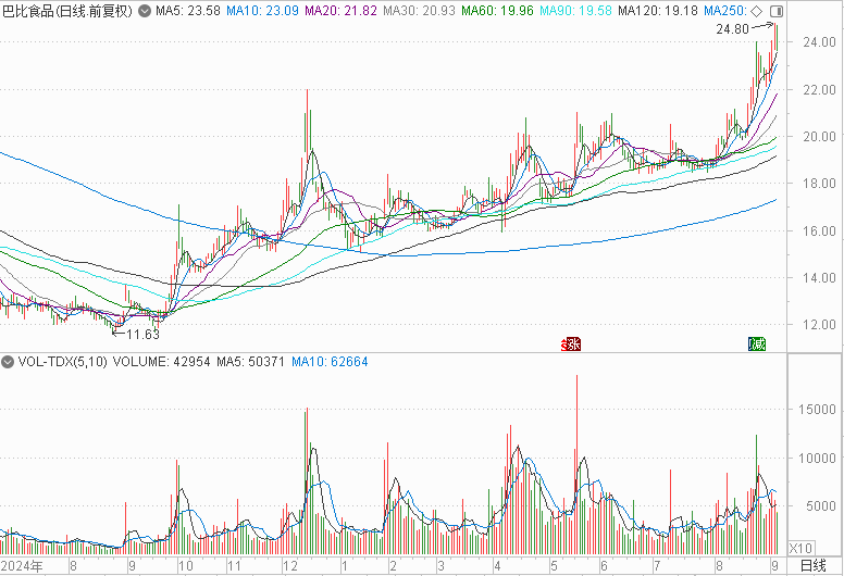 随着业绩持续回暖,巴比食品的股价也呈现稳步抬升的走势。以前复权方式计算,2024年8月公司股价最低跌至11.63元,创下上市以来的新低,但随后企稳回升,2025年9月2日最高涨至24.80元。相较于2024年的低点,巴比食品的股价已经翻倍。