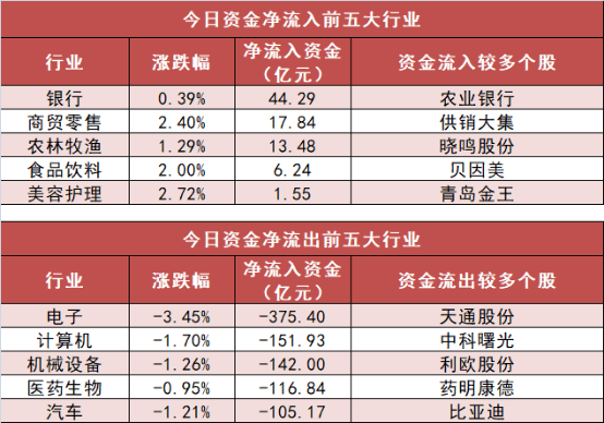 申万一级行业中,8个行业实现资金净流入,其中银行业净流入44.29亿元居首。