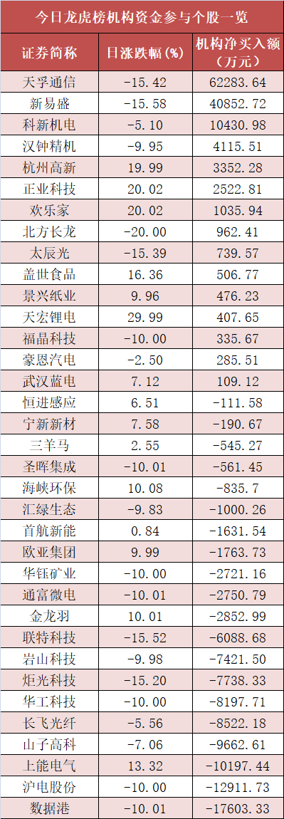 盘后龙虎榜数据显示,机构现身多股,其中天孚通信(300394)等股票呈现机构资金净买入,数据港(603881)等股票呈现机构资金净卖出。