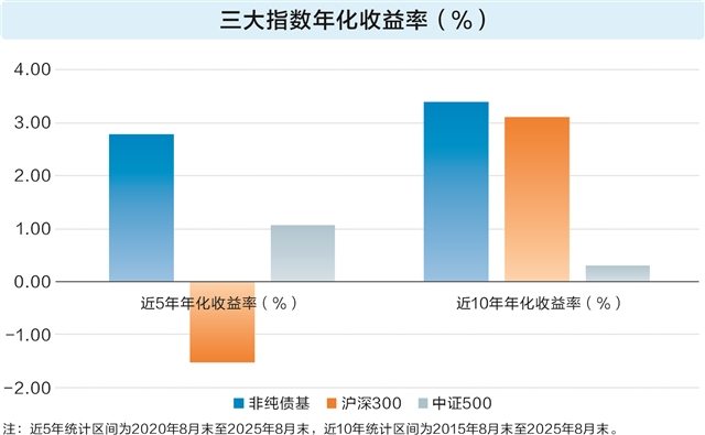 中长期来看,“固收+”基金在业绩和波动控制上优势显著。以中证非纯债债券型基金指数为例,该指数选取基金合同规定可投资可转债与股票的债券型基金作为成份基金,在一定程度上面反映了“固收+”基金的平均收益率水平。
