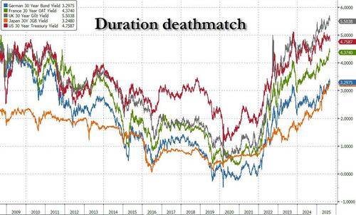 全球主要经济体长期国债收益率创多年新高,反映债券投资者对政府财政状况的深度担忧。英国长期国债收益率升至5.6%,为1998年以来最高水平;法国达到4.4%,创2009年新高;日本攀升至3.2%,触及1999年来峰值。