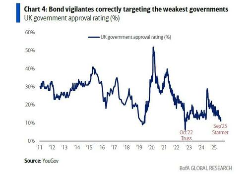 债券抛售背后是投资者对各国政府执政能力的质疑。英国首相斯塔默支持率暴跌至11%,创特拉斯以来最低;法国总统马克龙支持率跌至19%,为2016年来最差表现;日本自民党支持率仅24%,同样创2012年新低。