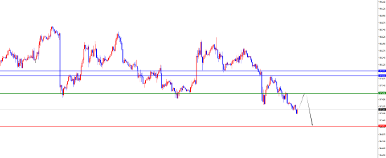 从多周期分析,周线级别来看近期价格在周线关键上下盘整,目前周线阻力于97.90区域,价格在此位置之下偏空对待,价格只有后续周线收盘在此位置上方才会转多。从日线级别看,随着时间的推移目前日线阻力于98区域,价格目前在此位置下方则偏空,近期价格在日线关键位置上下盘整,操作上需要关注四小时节奏。从四小时上看目前四小时阻力于97.60区域,价格在此位置之下偏空对待,在价格没有突破四小时阻力之前偏空对待,后续如若上破则需要及时掉头,目前暂时右侧交易方式对待即可。