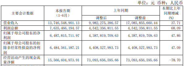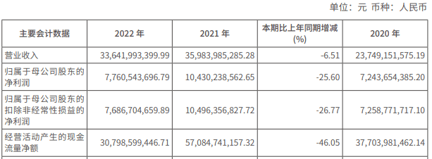 2022年,公司实现营业收入336.42亿元,同比下降6.51%;归属于母公司股东的净利润77.61亿元,同比下降25.60%;归属于母公司股东的扣除非经常性损益的净利润76.87亿元,同比下降26.77%。