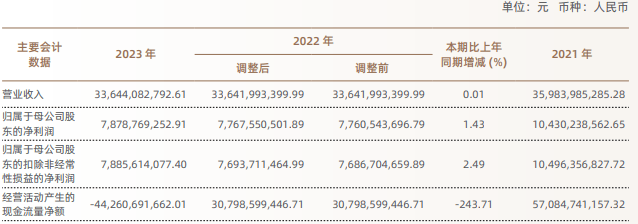 2023年,公司实现营业收入336.44亿元,同比增长0.01%;归属于母公司股东的净利润78.79亿元,同比增长1.43%;归属于母公司股东的扣除非经常性损益的净利润78.86亿元,同比增长2.49%。