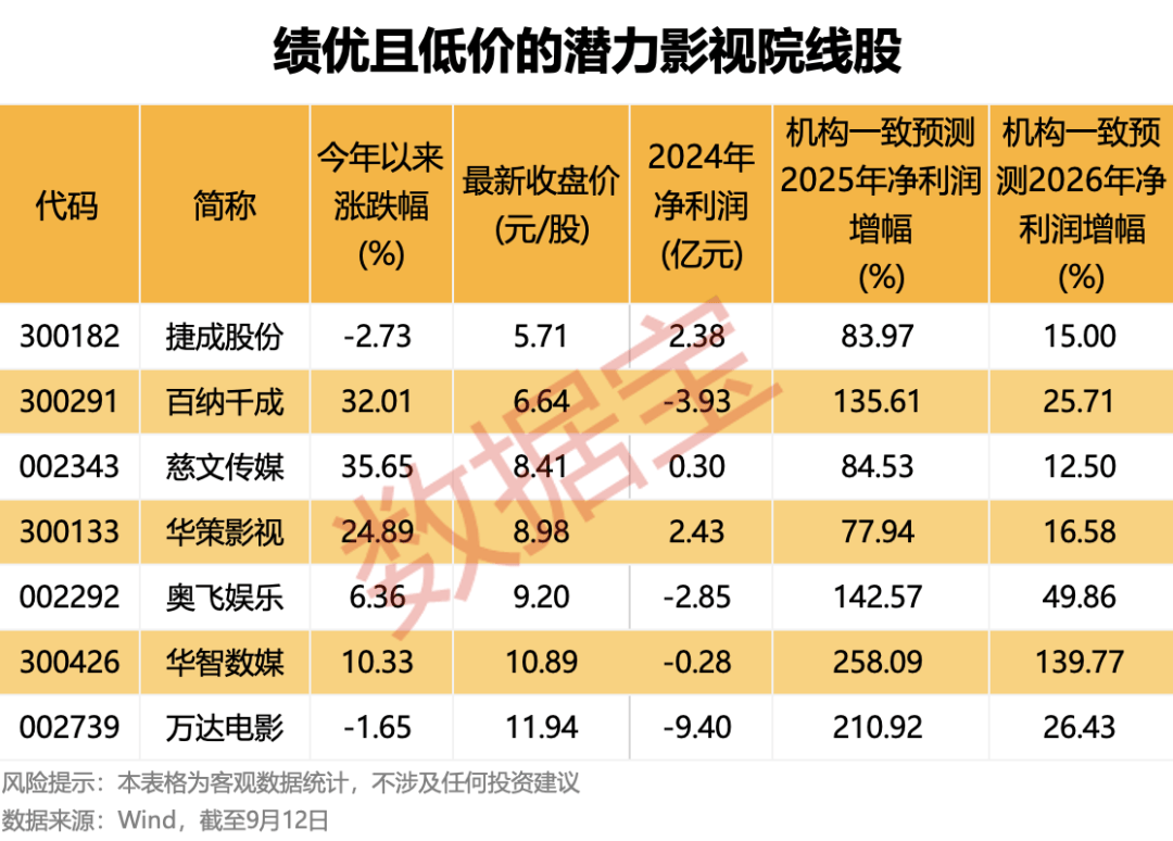 进一步来看,影视院线行业最新收盘价低于13元/股,且机构一致预测2025年、2026年净利润增幅持续超过10%的公司仅有7家。其中,收盘价较低的公司有捷成股份(300182)、百纳千成、慈文传媒。