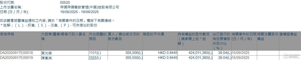 格隆汇9月18日丨根据联交所最新权益披露资料显示,2025年9月15日,呷哺呷哺(00520.HK)获执行董事兼主席贺光启在场内以每股均价0.8445港元增持35.55万股,涉资约30.02万港元。