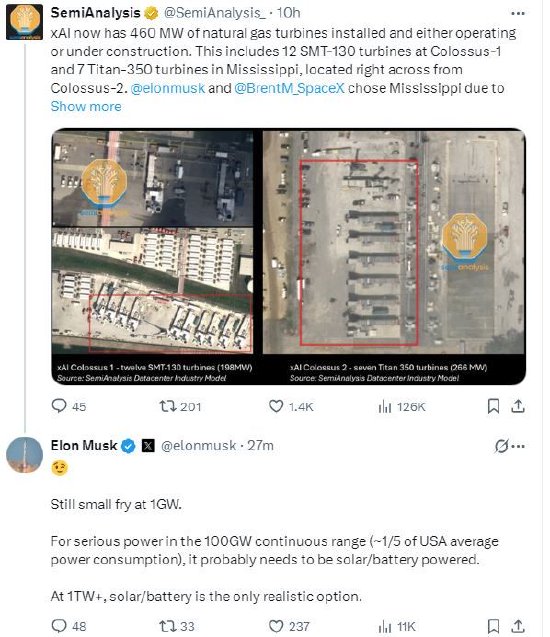 一位X用户发帖称:“xAI目前已经安装并运行或在建的天然气涡轮机容量为460兆瓦……xAI将成为第一个在单个数据中心站点达到1000兆瓦(1吉瓦)的公司。”