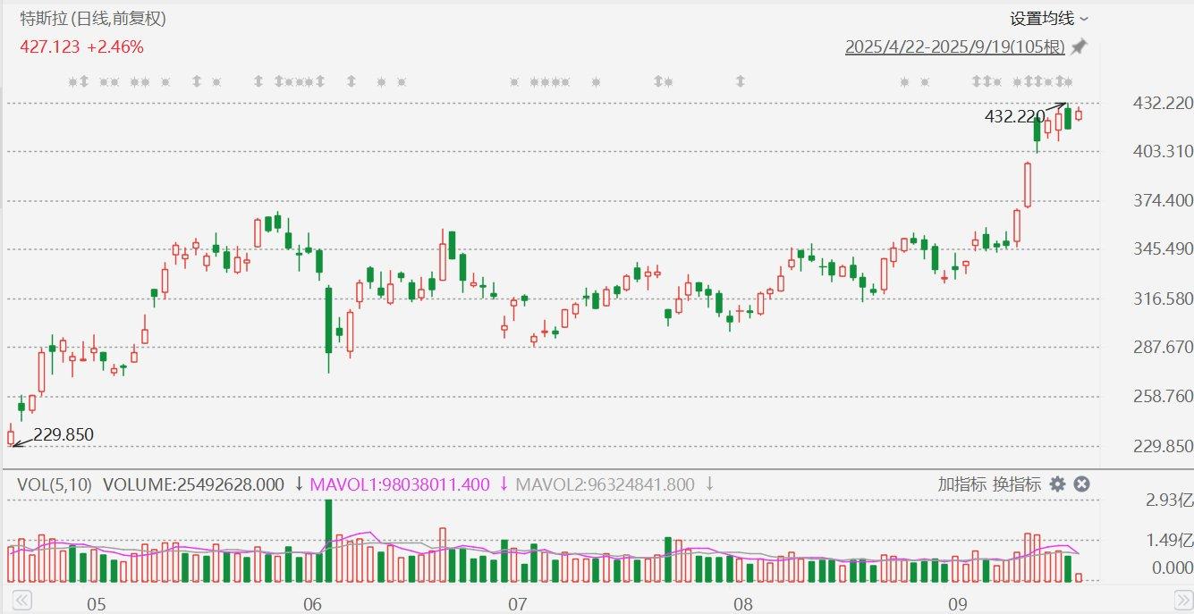 特斯拉(TSLA.US)盘中涨3%,报429.47美元。贝尔德上调特斯拉评级至“跑赢大盘”, 股价有望翻数倍。