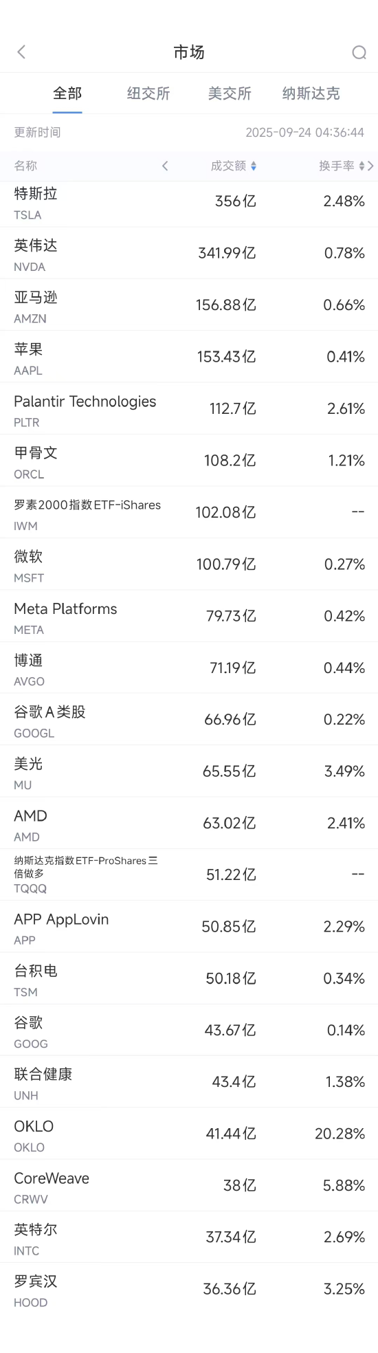 第5名Palantir收高1.80%,成交112.7亿美元。周二有报道称该公司将与波音公司在国防领域开展人工智能合作。