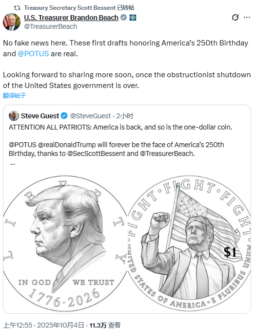美国财政部长贝森特转发关于打造印有特朗普头像的1美元硬币的贴文,贴文中官员Brandon Beach证实称,“这些为纪念美国建国250周年以及致敬总统特朗普而拟定的初步方案均为真实内容。”