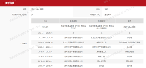 基金业协会网站显示,友安私募成立于2025年7月14日,2025年9月29日完成私募证券管理人登记。公司注册资本为1000万元,宋昆在公司持股51%。友安私募注册地址在广东省珠海市香洲区,办公地址在上海市浦东新区,目前有5名全职员工。