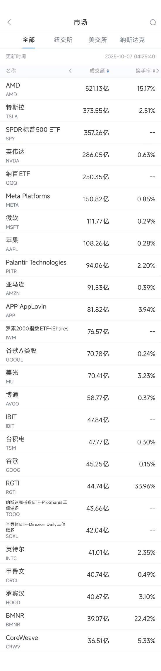 第3名英伟达收跌1.11%,成交286.05亿美元。高盛基于OpenAI合作将英伟达目标价上调至210美元。10月6日,AMD发布公告称,AMD向OpenAI发行了一份认股权证,OpenAI可以以每股0.01美元的价格购买公司至多1.6亿股普通股。而在9月22日,英伟达宣布将向OpenAI投资最多1000亿美元。