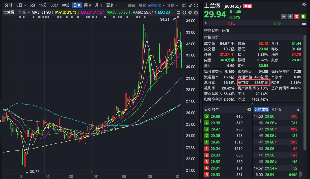 士兰微注册地位于杭州市,系国内主要的综合型半导体设计与制造(IDM)企业之一。公司主要从事硅半导体、化合物半导体产品的设计与制造,向客户提供硅基集成电路、分立器件和化合物半导体器件产品。截至10月19日,士兰微最新股价为29.94元/股,总市值约为500亿元。
