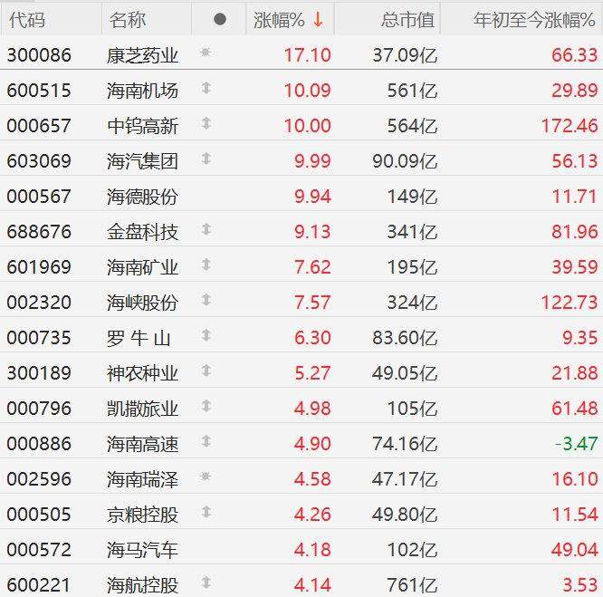 格隆汇10月29日|A股市场海南板块集体上涨,截至半日收盘,康芝药业(300086)涨超17%,海南机场、中钨高新(000657)、海汽集团(603069)、海德股份(000567)10CM涨停,金盘科技涨超9%,海南矿业(601969)、海峡股份(002320)涨超7%,罗牛山(000735)涨超6%,神农种业涨超5%,凯撒旅业、海南高速(000886)、海南瑞泽(002596)、京粮控股(000505)、海马汽车、海航控股(600221)涨超4%。