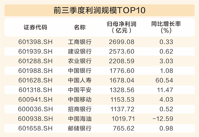 从单季度盈利表现来看,有113家上市公司第三季度归母净利润同比增幅超过10倍,6家上市公司实现百倍以上增长。中国人寿、工商银行单季度净利润超过千亿元,共有26家上市公司单季度净利润超百亿元。