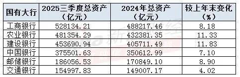 截至三季度末,六家国有大行资产规模均较上年末上升。其中,工商银行总资产规模接近53万亿元,为52.81万亿元;农业银行、建设银行分别以48.14万亿元、45.37万亿元位列二、三位,值得一提的是,两家银行总资产增速均为两位数,分别较年初增长11.33%、11.83%。