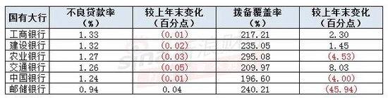 其他五家国有大行的不良贷款率均保持在1%以上,截至三季度末,中国银行不良贷款率1.24%,较上年末下降0.01个百分点;交通银行为1.26%,下降0.05个百分点;农业银行1.27%,下降0.03个百分点;建设银行1.32%,下降0.02个百分点;工商银行1.33%,下降0.01个百分点。