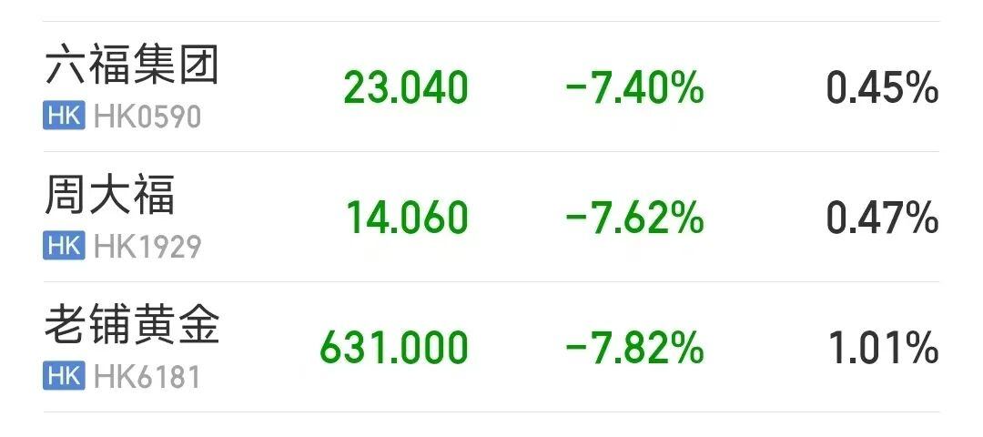 11月3日,港股黄金零售品牌商集体下挫。截至发稿,老铺黄金、周大福、六福集团大跌超7%,周生生跌超6%。