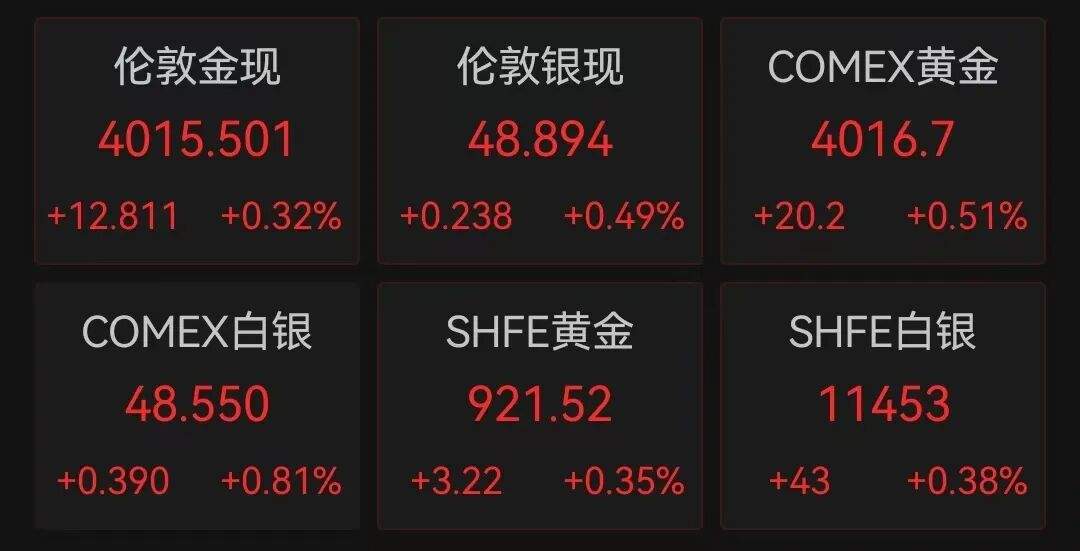 国际金价方面,11月3日,现货黄金、期货黄金下跌后迅速拉升。截至发稿,伦敦金现报4015.5美元/盎司,上涨0.32%;COMEX黄金期货报4016.7美元/盎司,上涨0.51%。