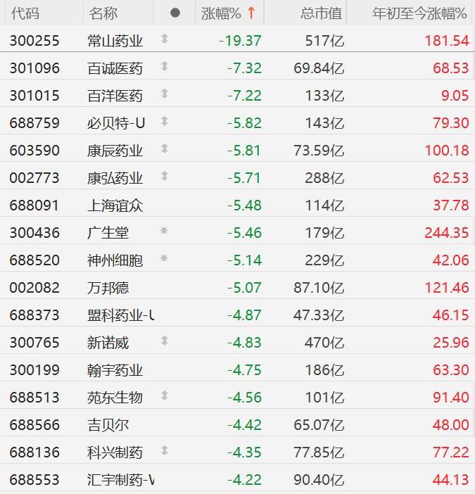 格隆汇11月4日|A股市场创新药概念股集体下跌,其中,常山药业(300255)跌超19%,百诚医药、百洋医药跌超7%,必贝特-U、康辰药业(603590)、康弘药业(002773)、上海谊众、广生堂(300436)、神州细胞、万邦德(002082)跌超5%。