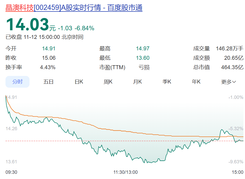 截至收盘,晶澳科技股价大跌6.84%,报收14.03元,总市值464.35亿元。