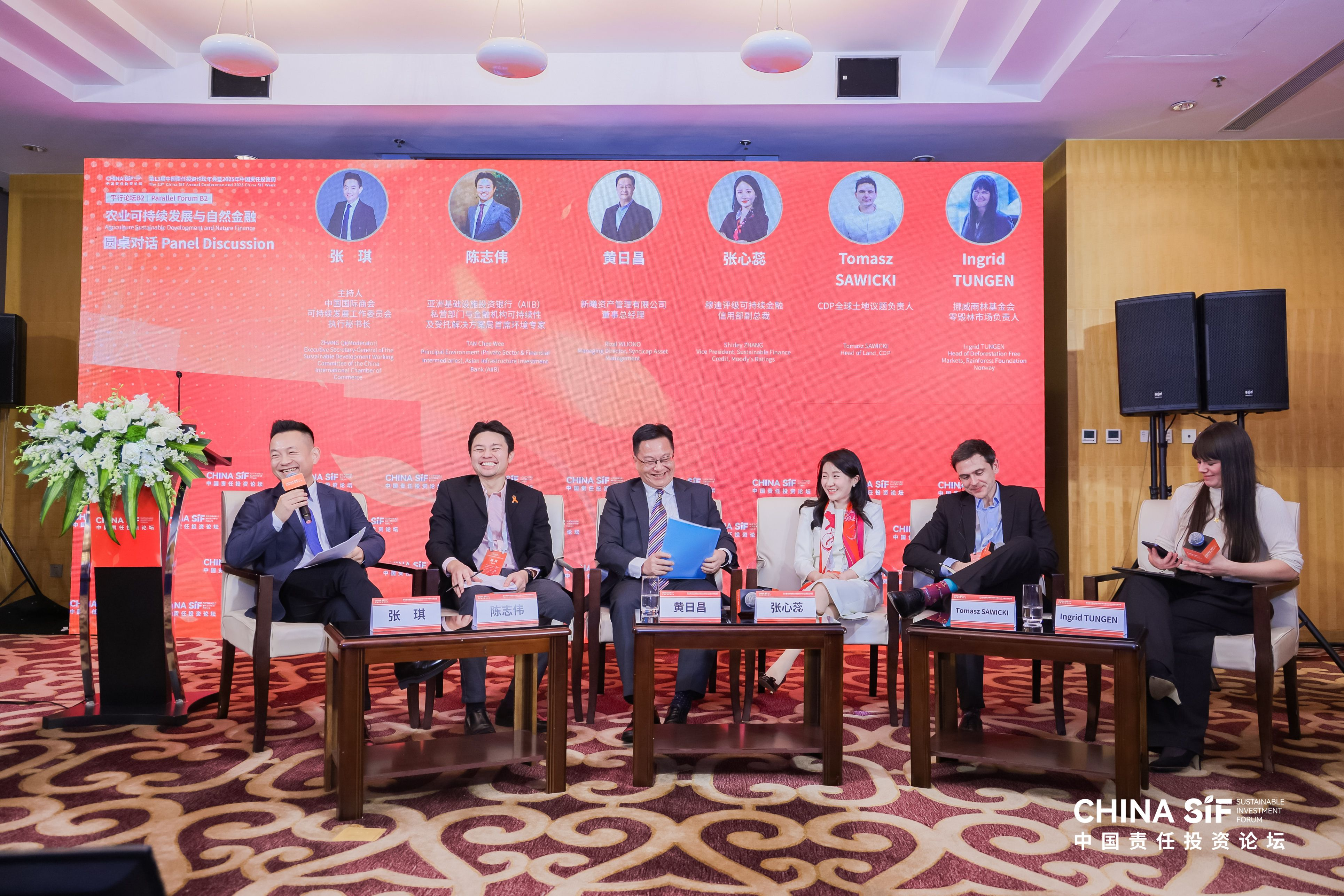 中国国际商会可持续发展工作委员会执行秘书长张琪主持圆桌对话环节。亚洲基础设施投资银行(AIIB)私营部门与金融机构可持续性及受托解决方案局首席环境专家陈志伟,新曦资产管理有限公司董事总经理黄日昌,穆迪评级可持续金融信用部副总裁张心蕊,CDP全球土地议题负责人Tomasz SAWICKI,挪威雨林基金会零毁林市场负责人Ingrid TUNGEN讨论如何通过多方协同推动农业可持续供应链建设,包括当前的核心通点与破局路径,绿色金融工具创新与应用以及跨境标准等。Tomasz SAWICKI特别指出,CDP通过与全球主流披露标准不断对齐,希望通过环境信息披露的方式,助力创新金融推动自然转型,推动企业更加全面评估和管理自然相关风险。