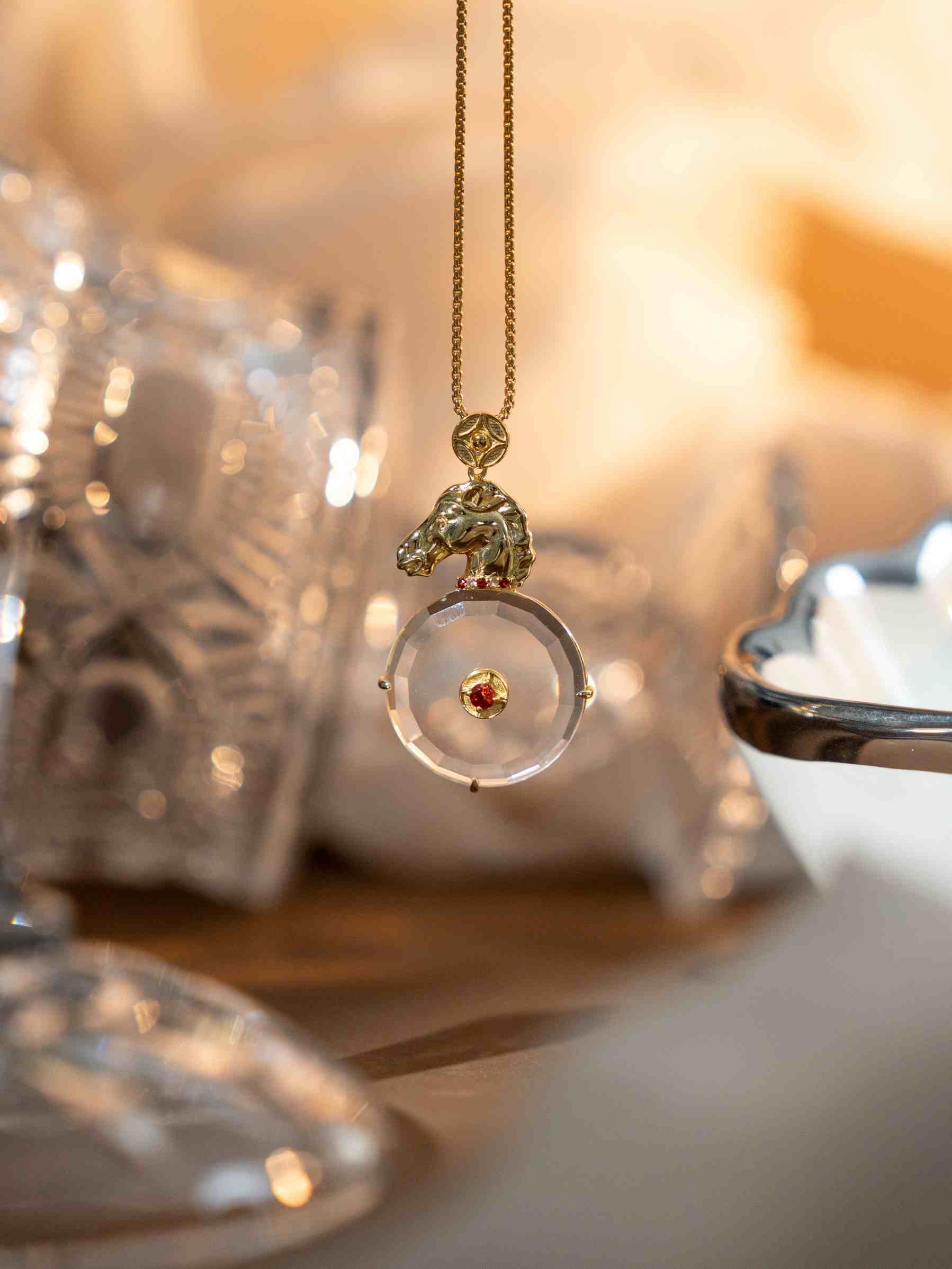 “马上有钱”这一直白的民间吉语,寄托着新年的财富祈愿。MiNG名皇珠宝“飞骏(马年生肖系列)-马上有钱项链”以更具深度与温度的设计转译这份祝福。马首造型采用高浮雕立体工艺,鬃毛细节清晰、柔和细腻,展现力量与复古韵味;下方悬挂着嵌有石榴石的圆牌,打磨得饱满莹润。石榴石在珠宝语汇中寓意活力、守护与丰饶,其炽热的红色为马首的刚毅之姿注入了“生活红火”的温情底色,蕴含着对事业顺遂、生活美满的双重期许。新年走亲访友时佩戴,红色与金属色的搭配衬得气色正好;日常通勤配衬衫,圆牌在颈间轻轻晃动,低调中藏着美好祝福。
