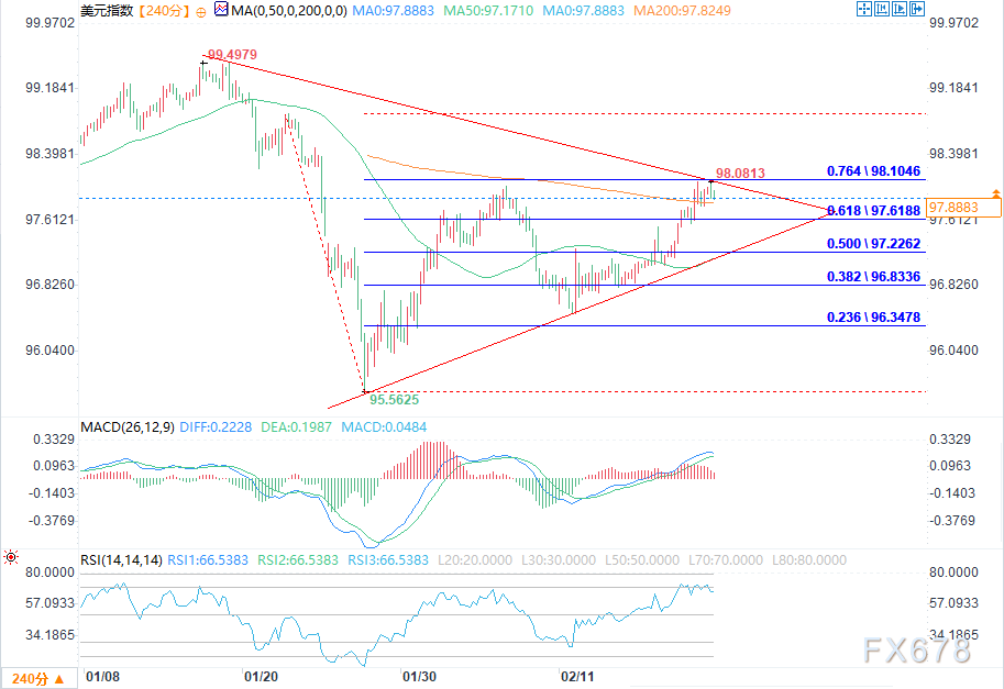 汇通财经APP讯――周五(2月20日)欧盘时段,美元指数亚盘时段在97.75-98.05区间震荡,多空博弈明显;进入欧盘后,价格企稳于97.88上方,短线偏多格局有所强化。当前美元呈现明确震荡走强态势,在地缘、政策、数据等多重因素交织影响下,后续仍有充足反弹空间。