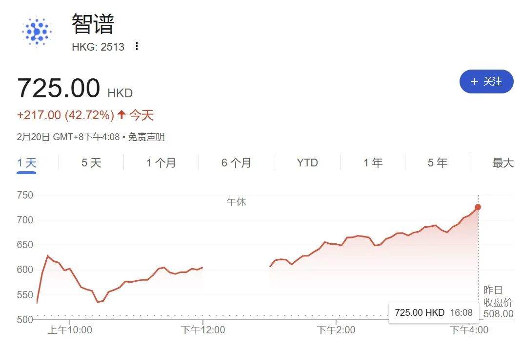 2月20日,港股马年首个交易日,有“全球大模型第一股”之称的智谱收涨超42%,市值突破3232亿港元。2月以来,该公司股价累计涨幅超过220%,上市以来的涨幅则达到523%。