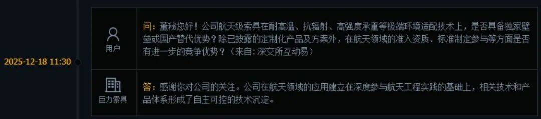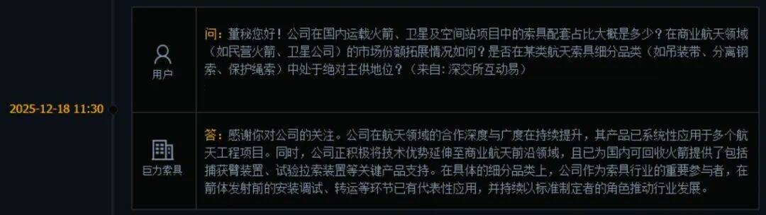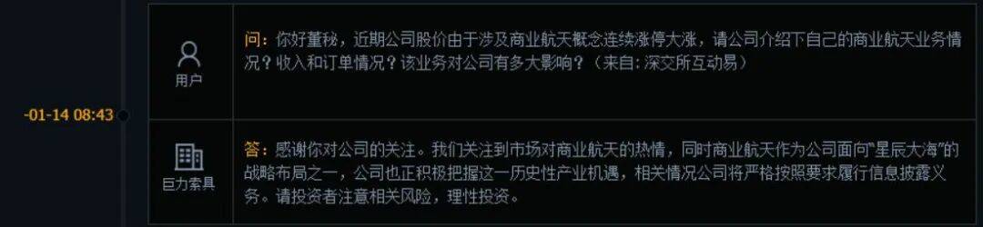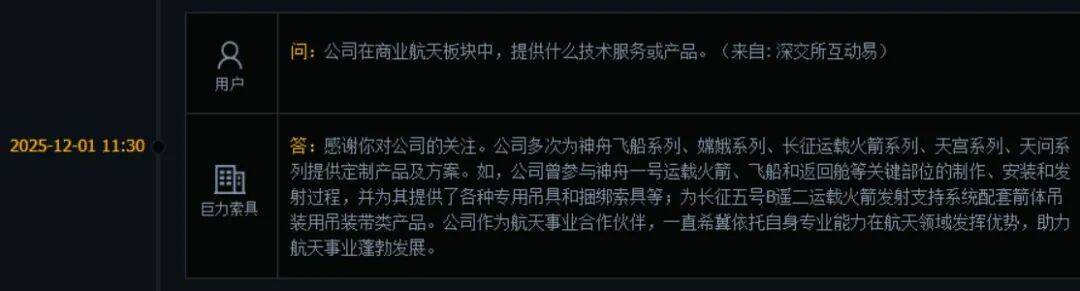 然而,与以上澄清公告形成鲜明对比的是,此前在巨力索具股价上涨初期,公司在深交所互动易平台多次认领“商业航天概念”身份,并提到“为国内可回收火箭提供支持”“积极把握商业航天历史性产业”“产品已系统性应用于多个航天工程项目”等情况。