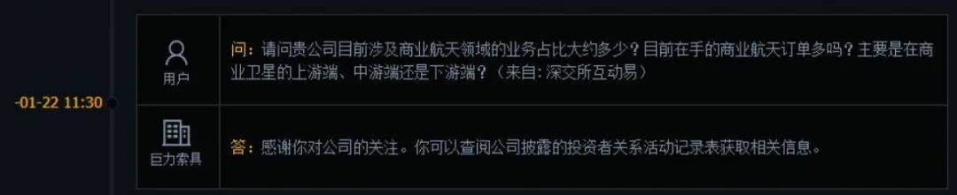 实际上,此前在公司股价上涨中期,公司的商业航天相关业务曾引起投资者疑问。如1月22日,有投资者在深交所互动易上提问“请问贵公司目前涉及商业航天领域的业务占比大约多少?目前在手的商业航天订单多吗?主要是在商业卫星的上游端、中游端还是下游端?”