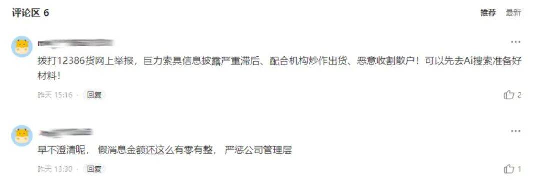 近日,巨力索具在发布澄清公告、股价连续跌停后,有投资者在股吧等平台表达不满,要求索赔和举报。甚至有投资者称“公司存在澄清严重滞后、信息披露不及时、配合资金收割散户的重大嫌疑,涉嫌违反信息披露相关规定。”也有投资者表示要举报。
