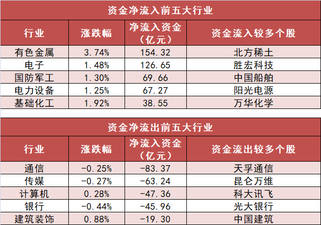 申万一级行业中,20个行业实现资金净流入,其中有色金属行业净流入154.32亿元居首。