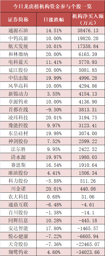 盘后龙虎榜数据显示,机构现身多股,其中通源石油(300164)等股票呈现机构资金净买入,翔鹭钨业(002842)等股票呈现机构资金净卖出。