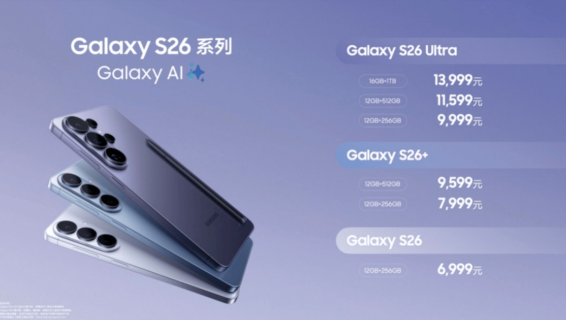 三星Galaxy S26系列提供幽夜紫、映雪白、旷宇黑与浅云蓝四款配色,以及绯霞金与镜月银两款专属色,三星Galaxy S26 Ultra厂商建议零售价9999元起,三星Galaxy S26+厂商建议零售价7999起,三星Galaxy S26厂商建议零售价6999元。