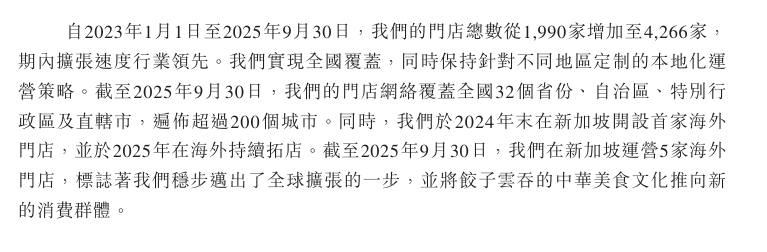 按门店数量计,截至2025年9月30日,公司为全球最大的中式快餐企业;按饺子及云吞产品GMV计,为中国最大的饺子云吞企业。