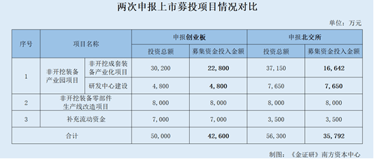 可以发现,唐兴科技两次申报的募投项目一致,而相较于前次创业板申报的募投项目,此次上市的募投项目除了非开挖装备零部件生产线改造项目以外的项目拟募集资金均做有所调整。