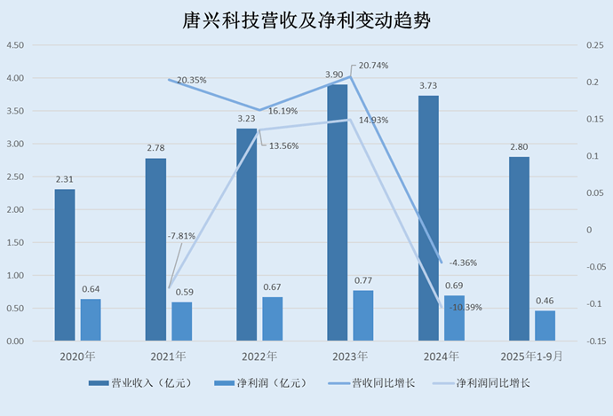 不难看出,2024年,唐兴科技的营收及净利增速双双告负,2025年1-9月增速回正。