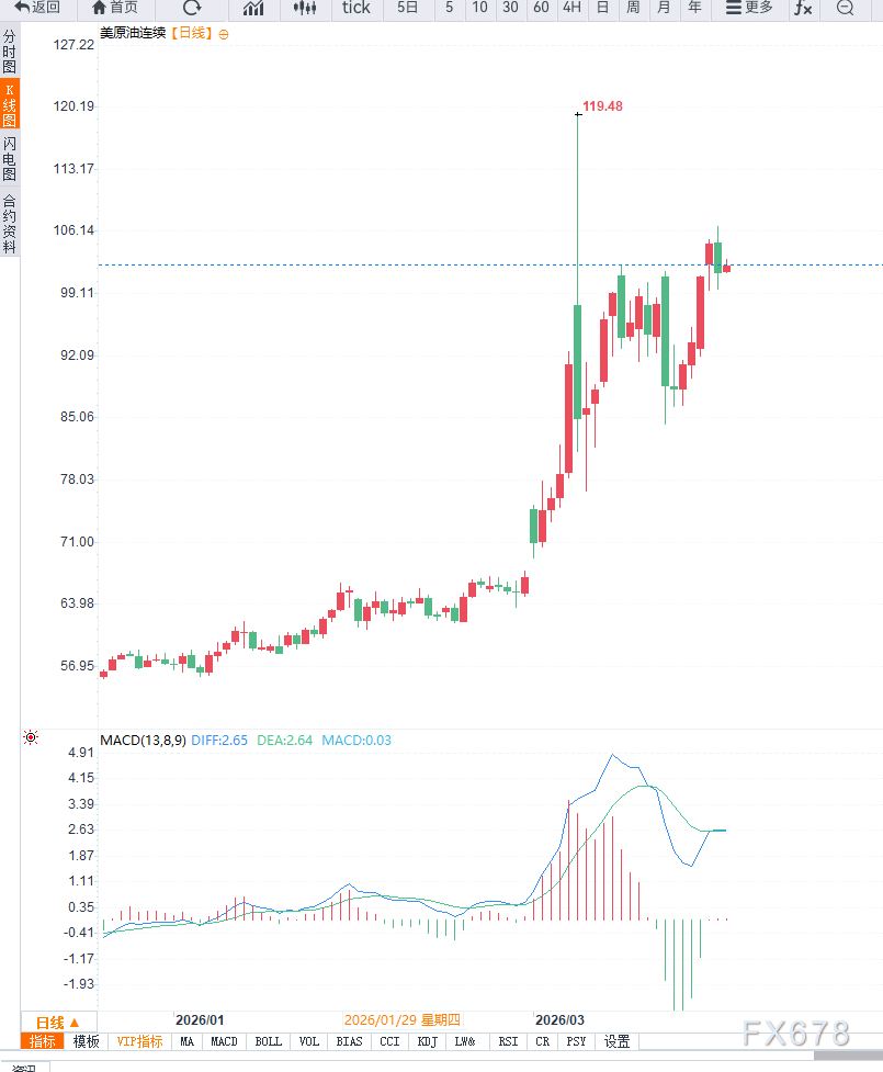 这一变化对全球原油市场的意义在于,美国页岩油曾在2022年俄乌冲突后扮演“供给缓冲器”的角色,在油价上涨周期中快速增产以平抑市场波动。然而当前情况发生转变,高油价并未显著刺激产量回升,反而反映出资本约束、成本上升以及企业回报优先策略的影响,使得供给端反应更加迟缓。美国页岩油对油价的调节能力正在明显弱化。与此同时,中东局势持续扰动市场神经。伊朗与西方关系紧张叠加地区冲突,使市场对霍尔木兹海峡运输安全的担忧显著升温。该海峡承担全球约20%的海运原油运输,一旦运输受阻,将直接冲击全球供应链稳定。尽管美国方面释放出可能在数周内结束军事行动的信号,但不确定性依然较高,市场仍在为潜在供应中断计入风险溢价。从价格驱动逻辑来看,当前油价上涨并非源于需求端显著扩张。全球经济增长节奏整体平稳,原油消费未出现超预期提升,供需格局并未发生趋势性变化。油价的核心驱动力已由基本面转向地缘情绪。这种结构意味着,价格波动更依赖事件驱动而非长期供需变化。市场情绪层面,投资者正处于高度敏感状态。一方面,美国供给弹性下降强化了中期看多逻辑;另一方面,若中东局势缓和,当前计入的风险溢价将迅速回吐。资金在多空之间频繁切换,使油价呈现高位震荡特征。从技术面来看,日线级别油价整体仍处于高位整理区间,价格多次在108美元附近遇阻,显示上方抛压较重,而下方100美元构成关键支撑区域,体现多头防守意愿。动能指标显示上涨动能有所减弱,但尚未形成趋势性反转信号。4小时级别来看,短期走势呈现震荡偏弱结构,价格在区间内反复测试支撑与阻力,若有效跌破100美元,可能触发技术性止损盘并加速下行;反之,若地缘风险再度升级并推动价格突破108美元,则有望打开新的上行空间。