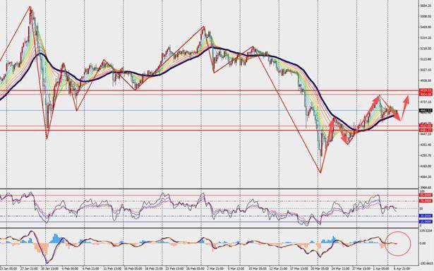 技术面:黄金H4级别小幅震荡,并在48日多空分界线附近运行。另一方面,MACD双线和量能柱在零轴附近收敛。投资者需密切关注本周美联储会议记录及CPI数据,谨慎注意4600-4700区间的突破机会。