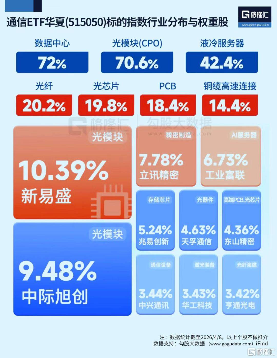 通信ETF华夏(515050)聚焦AI算力龙头,标的指数中光模块CPO概念股权重占比达70.6%,光纤、光芯片占比均超19%,PCB电路板占18.4%,此外散热核心――液冷服务器概念股权重达42.4%,覆盖通信算力硬件全产业链生态,权重股中新易盛、中际旭创、天孚通信三大光模块龙头公司合计权重24.5%。