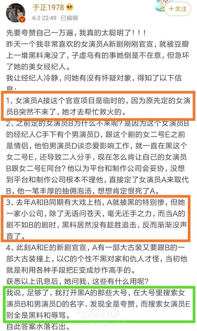 于正的证据是:“我打开那些黑A的大号,在里面搜索女演员B和男演员D的名字,发现全是夸赞,而所有女演员E则是黑料和辱骂。”